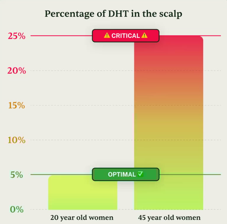 By the time you start noticing more hair in your brush than usual, DHT has likely already impacted nearly 25% of your scalp — the point where thinning becomes visibly noticeable.